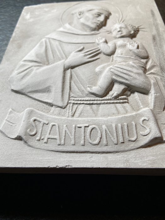 Het reliëf stelt de heilige Antonius voor met het kindje Jezus, een bijzondere voorliefde voor kinderen. Van de wonderen die hij tijdens zijn leven verrichtte, kwamen sommige kinderen ten goede. Zo ontstond de traditie om de kleintjes vanaf hun geboorte onder de bescherming van de heilige te plaatsen, monnik en kerkleraar in de 13e eeuw. Na het kortste heiligverklaringsproces in de kerkgeschiedenis tot nu toe, werd hij al elf maanden na zijn dood door Gregorius IX. heilig verklaard. Hij verrichtte tijdens zijn leven talloze gedocumenteerde wonderen en werd in 1946 ingehuldigd door paus Pius XII. Benoemd tot dokter Evangelicus. Conditie zie foto's.