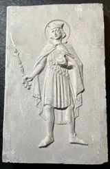 Het reliëf stelt Sint Oswald voor met een raaf en een ring in zijn bek.Hij sneuvelde in de Slag bij Maserfield (nabij de grens met Wales) op 5 augustus 642 en werd door zijn Merciaanse tegenstander Penda in stukken gehakt, zijn hoofd gespietst op een paal.