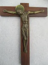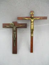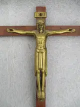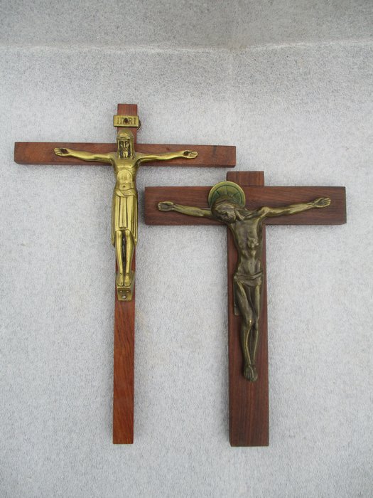 Lot van 2 Art Deco Crucifixen circa 1930-1940. In goede staat, 1 in brons de ander in verguld metaal. Christus in brons gesigneerd op de rand "HARTMANN" voor Jacques Hartmann (1908-1994) bronsgieter-decorateur, die gespecialiseerd was in religieuze beeldhouwwerken waaronder monumentale composities voor religieuze plaatsen en monumenten. Brons alleen met afmetingen 14cm x 13cm. Totale afmetingen met de houten kruizen: 25cm x 16cm voor de gouden Christus en 20cm x 15,2cm voor de bronzen. Totaal gewicht voor het paar bijna 0,5 kg