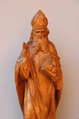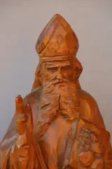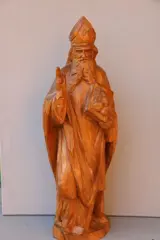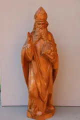 Houten eiken beeld van een Heilige Bisschop, waarschijnlijk Andreas, het beeld is gemaakt van eiken en is circa 60cm hoog. Het weegt 4.2 kilo. De kleur is donkerder, de lichtere kleur komt door de zon tijdens het fotograferen.