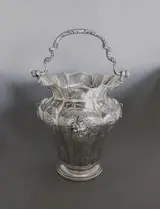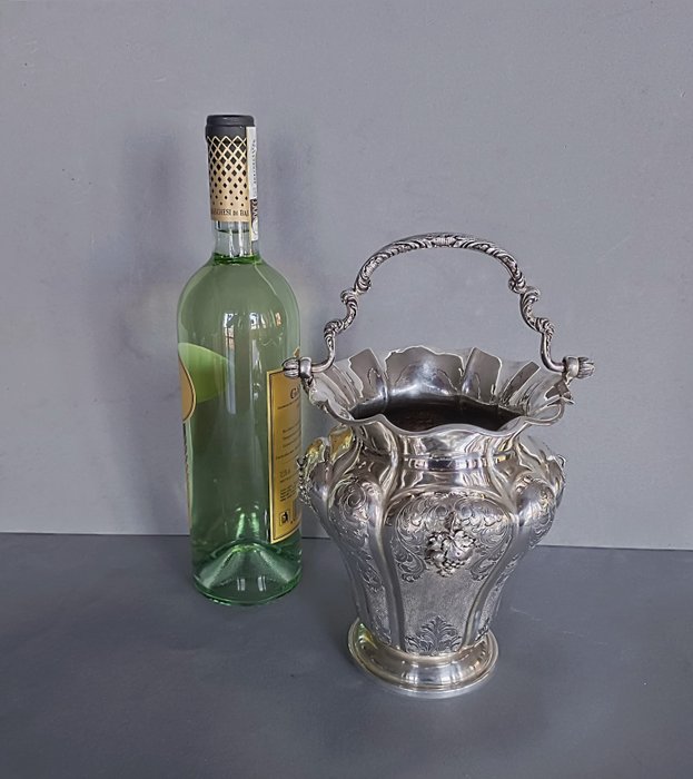Uitzonderlijke kwaliteit, vervaardigd uit het begin van de 20e eeuw, massief 800 zilver, groot formaat wijwateremmer, emmer met sierlijk slingerhandvat, fijn reliëf met aangebrachte wijnranken omgeven door met de hand gegraveerde naturalistische rollen op gematteerde ondergrond