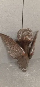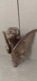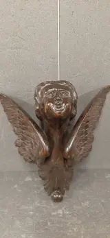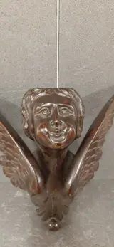 Gevleugeld engelenhoofd met de hand gesneden uit walnoot uit de eerste helft van de jaren 1900. Ik denk dat het een basis is voor een kerkelijke plank, waar toen kandelaars of andere sculpturen op stonden. Afmeting 46x45x25 cm. Ik denk dat het handig is om te verzenden met de 2 vleugels los (slechts 2 spijkers), op deze manier wordt de integriteit van het product gewaarborgd, eventuele afspraken worden echter na de verkoop met de koper gemaakt.