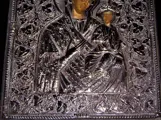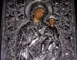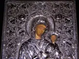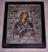 Grieks zilveren icoon, met de hand beschilderd, huidige heilige moeder van God die Jezus vasthoudt.