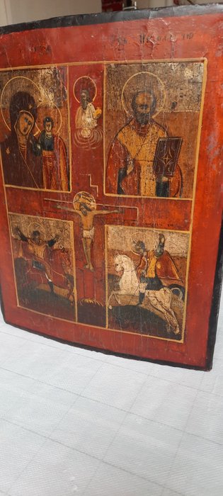Grote Russische icoon met vier velden, begin 19e eeuw. Het is eitempera op een gipsachtergrond op een houten paneel. De twee geprofileerde achterste Sponki zijn aanwezig. De icoon toont de Moeder van God "vreugde voor allen die rouwen", St. Nicolaas, St. Michaël en St. Joris in gevecht met de draak. Afmetingen 31,0 x 25,5 x 3 cm. Het werd gekocht bij het Mars Auktionhaus in Würzburg in Duitsland: een van de belangrijkste wereldveilingen van Iconen. De originele aankoopdocumentatie is op aanvraag verkrijgbaar.