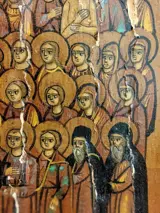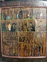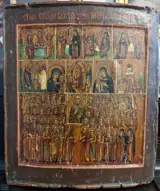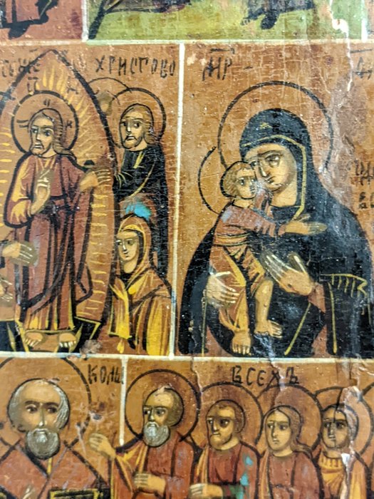 Tempera op krijtgrond op houten paneel met twee rug-Sponki, dubbele kovtscheg. Drie horizontale registers met feestdagen en wonderbaarlijke afbeeldingen van de Moeder Gods in de twee bovenste gebieden en Allerheiligen voor de icoon met Sinterklaas in de onderste helft. Klein foutje. Rand licht beschadigd.