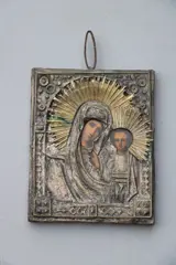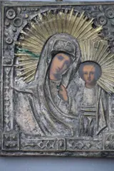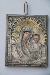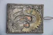 Mooie kleine icoon van Maria en Jezus. Jezus in half portret. Messing en metaal. Achterkant hout. Redelijke staat.