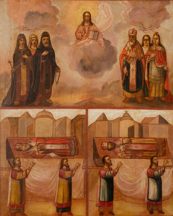 Antieke Russisch-orthodoxe icoon van de Dormition van Saint Joseph, de Hesychast met Sint Nicolaas, Jezus Christus en andere heiligen.