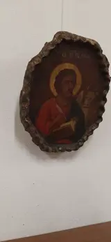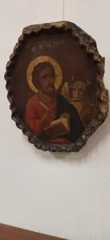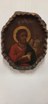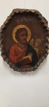 Icoon uit ongeveer het midden van de 19e eeuw en voorstellende een heilige Lucas de evangelist. Grieks scooppictogram, ovale vorm met geribbeld frame uitgehouwen in een enkel blok hout met het schilderij. Het heeft een patina van de tijd en meet 28x23x5 cm. Vanwege de huidige regelgeving kan het niet buiten de Europese Unie worden verzonden.