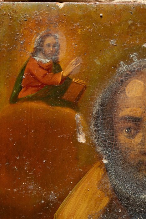 Het messing heeft oxidatie op het oppervlak en is ook versleten door de leeftijd, er zijn scheuren aan de zijkanten bij de spijkers. De icoon heeft de gebruikelijke lakscheurtjes vanwege de leeftijd. Het heeft ook hier en daar verfafbladdering. De lijst van de kiot is verguld, maar heeft slijtage, ook houtslijtage. Zie alle foto's.