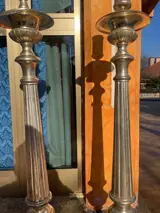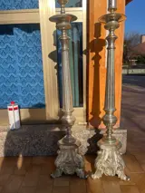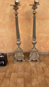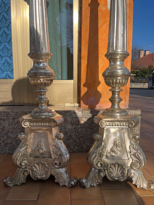 Kandelaar kandelaars in massief brons 110 cm hoog, verzilverd, zeer gedecoreerd en bewerkt, wegen ongeveer 8/9 kg per stuk ... ze zijn mooi en opzichtig. Het zilver is in goede staat en nog 70/80% aanwezig....