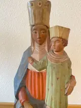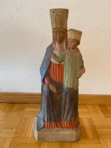 Het beeld is uit 1 blok hout gebeiteld en daarna handbeschilderd.