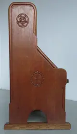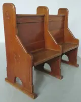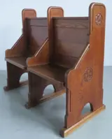 Deze massief eiken kerkbank heeft fraai snijwerk aan de zijkanten.