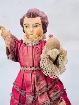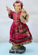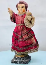 Oud Kind Jesus van Tabernakel met in hand bol en zegen. Het is een oude figuur in klederdracht met metaal en fluweel met een prachtig polychroom stucwerk. Het heeft een eenvoudige restauratie nodig, zoals te zien is op de foto's.