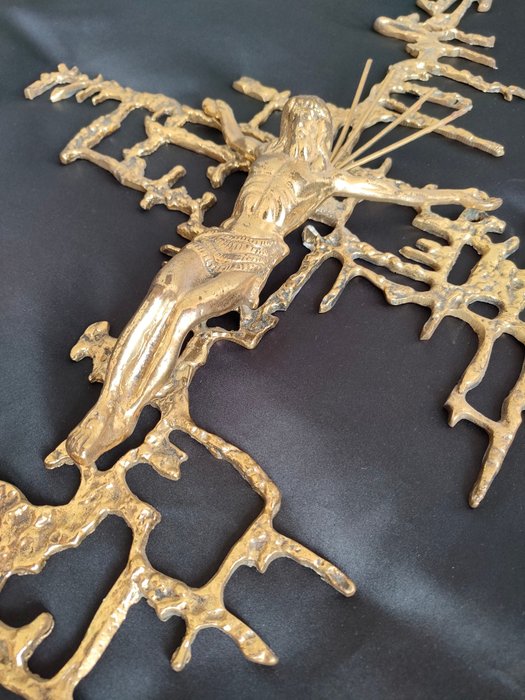Kostbaar surrealistisch enorm kruisbeeld of Christus in verguld brons met reliëfs. Het is een exclusief designmodel geïnspireerd op Salvador Dalí uit het einde van de 20e eeuw. De algemene esthetiek van het stuk is uniek en goed bewaard gebleven. Het is een prachtig kruis!