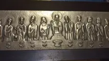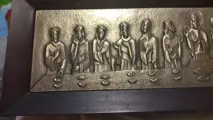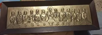 Bas-reliëf in 925 zilver, door de kunstenaar Ottaviani, beeldt het laatste avondmaal uit, heeft een houten frame van 36,5 x 13 cm, dikte 2 cm, het bas-reliëf meet 32,5 x 8 cm,5 gegraveerd de handtekening van Ottaviani met zilversmidsmerkteken N. 8 van Modena en de 925 gehalte van het zilver, productieperiode tweede helft 1900, in uitstekende staat.