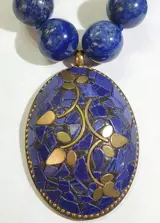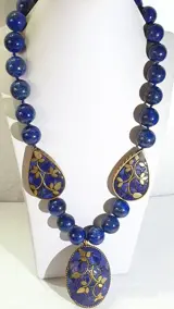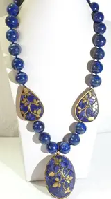 3 beschermende boeddhistische metalen en geëmailleerde amuletten die kersenbloesems voorstellen, een symbool van zuiverheid, met een ketting van grote stukken lapis lazuli (15 mm). Professioneel met de hand gesponnen met knopen in elk stuk lapis lazuli.