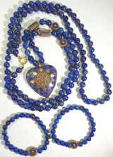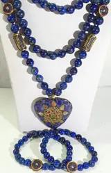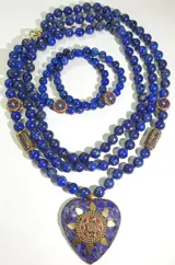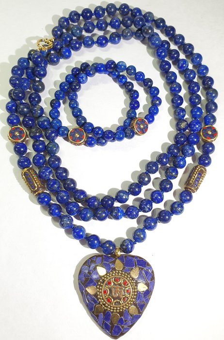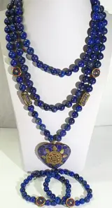 Professioneel handgesponnen collier met een knoop in elk stuk van natuurlijke lapis lazuli en amulet.
