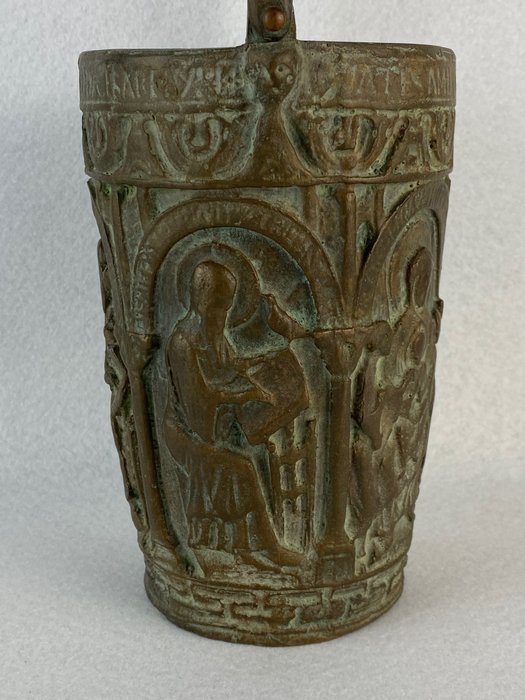 Liturgische emmer met revivalvoorstelling in Byzantijnse stijl, massief bronsgieten met de hand bewerkt en afgewerkt, Italiaanse fabricage uit de eerste helft van de 20e eeuw, goede algemene staat van bewaring, afmeting 13x12xh26,5cm, zorgvuldige verpakking en aangetekende verzending.