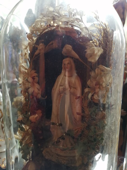 Prachtig Lot 3 Circa 1860,s Stolpen met Inhoud 2 Ovaal Met Vieux Paris Maria Madonna met 2 Vaasjes en Bloemen 1 Ronde met Maria Madonna Bloemen