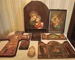 (1) Kleine handbeschilderde houten icoon van de Madonna met kind (11,2x9x2cm; 90 g)