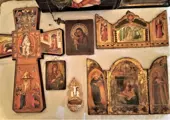 (1) Triptiek in hout en met de hand beschilderd, voorstellende de Madonna met kind en twee zijdelingse engelen (18x24,7 cm open; 149 g)