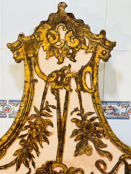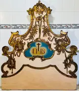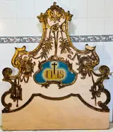 Oude kerkhemel voor Christus met olieverfschilderij in het midden met de initialen van Jezus en met details van barokstijl in bladgoud rondom. Het is een groot hout uit één stuk met verstevigingen aan de achterkant, zeker meer actueel.