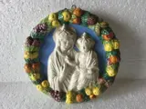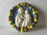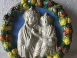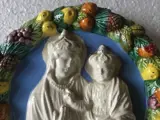 Tondo met Madonna en kind in geglazuurd keramiek in Della Robbia-stijl omgeven door een lijst van groenten en fruit.