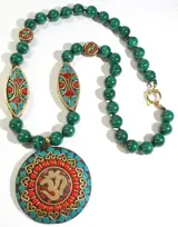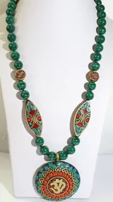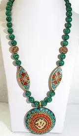 Professioneel handgesponnen collier met een knoop in elk stuk van natuurlijk malachiet en amulet.