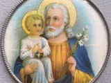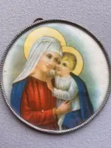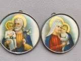 Twee afbeeldingen: Maria met Jezus en Jozef met Jezus. Beiden ingelijst in een kleine dunnen metalen rand, voorkant voorzien van glas. Karton achterkant vervangen in de jaren 2005-2008. Mijn inziens gemaakt in periode 11940-1950. Ze zijn in redelijke staat en circa 8cm doorsnede. Ze horen bij elkaar.