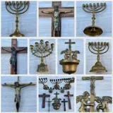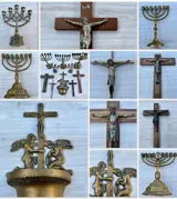 Menora, Chanoeka, Doopvont en kruizen (10) - Messing, hout, metaal - 19e eeuw