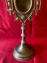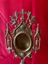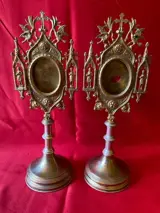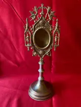 Paar monstransen voor reliekschrijnen, begin 20e eeuw, in verguld brons. Gebruikt missen ze het voorste glas en worden ze aan de achterkant afgesloten door een metalen deksel. De voet en de steel zijn eenvoudig liggend rijk is de versiering van het bovenste gedeelte waar 2 heiligen zijn afgebeeld op de zijkanten van de kast staan bovenaan twee adelaars, symbool van Christus, waarvan zij de hemelvaart en het koningschap voorstellen. Ten slotte maken de Psalmen het een symbool van spirituele regeneratie, zoals de feniks. De twee adelaars worden ondersteund door de gastheer van een klein kruis dat er bovenop is geplaatst.Elk reliekschrijn is 33 cm hoog, heeft een breedte van 12 cm op het maximale punt en een basisdiameter van 10 cm. Het aangegeven gewicht van 1100 gram slaat op beide. De ene reliekschrijn weegt ongeveer 550 g, de andere ongeveer 548 g.