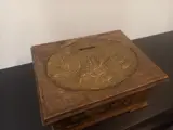 Een religieus offerblok of geldkistmet koperen handgemaakte plaquettes met oude symboliek van eventueel Sint Nikolaas met snoepgoed zakof carnavaleske snoepzak en klavers vier aan de zijdes (zeer oud middeleeuws symbool).