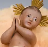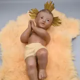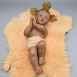 Olot - Oude baby Jezus, van goede grootte, zwager en gemaakt van gestuukte houtpasta en glazen ogen, metalen kroon van 3 krachten.