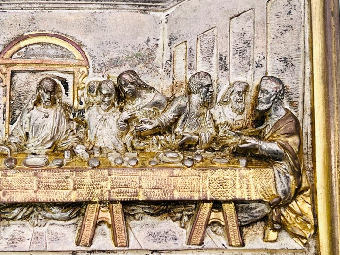 Oude reliëfplaat van het Laatste Avondmaal gemaakt van goudverchroomd metaal en met kostbaar goudsmidswerk.
