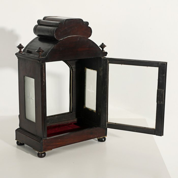 Oratorium, romantische stijl, in edel palissander, ingelegd met metaal en parelmoer, architectonisch gevormd, met gebogen cymatium en pinakels, glazen deur, gedraaide voeten. Erg zeldzaam. Portugees, 19e eeuw. Afmetingen: 46x29x17 cm. In goede staat.