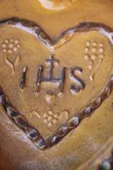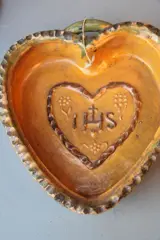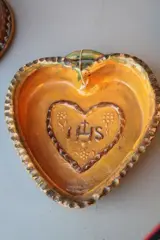Aangeboden een oude pastei vorm met de afkorting IHS en een kruis. Pasteivorm is in hartvorm. Het hart is 23cm breed en 35cm hoog. De diepte van de pasteivorm is 4cm. Gezien de leeftijd meer als decoratie te gebruiken dan in de oven te doen.