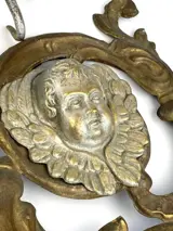 Paar metalen friezen in reliëf die de hoofden van gevleugelde engeltjes voorstellen.