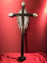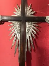 Groot altaarkruis in echt rozenhout en versieringen in echt zilverfolie (getest in het laboratorium). Vermoedelijk Frans of Praags artefact, gemaakt in de eerste helft van de 19e eeuw. Redelijk goede bewaarcondities: oxidatie en gebruikssporen. Verzending alleen in EUROPA, professionele verpakking.