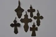 5 zeer interessante en fraaie devotiehangers uit de 17e-19e eeuw. Prachtig patina. Alle zijn draagbaar, De lengte varieert van 5,5 tot 3 cm.