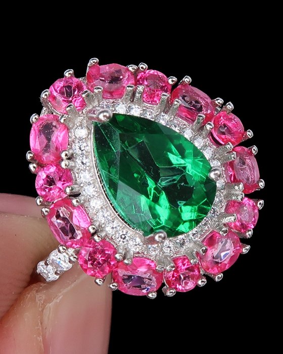 Prachtige grote trouwring versierd met roze en groene topazen.