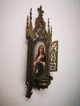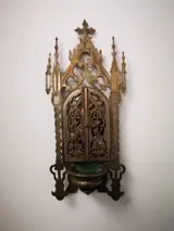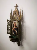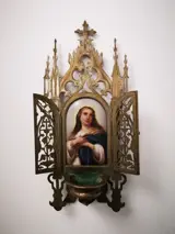Wijwater-reisaltaar "om op te hangen of te staan" in fijn gebeiteld zilvermetaal in de stijl van de kathedraal en het grote handbeschilderde porseleinen medaillon dat Maria Magdalena voorstelt.