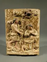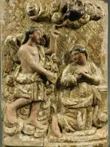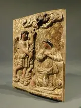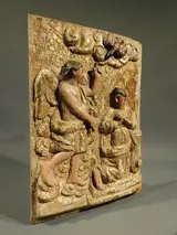 Fraai houten paneel met voorstelling van de "Annunciatie " (aankondigding van de boodschap van de aartsengel Gabriel aan Maria)