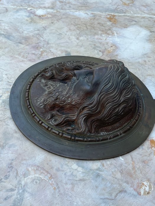 Ronde bronzen wandplaat - gezicht van een lijdende Christus in tranen met zijn ogen dicht