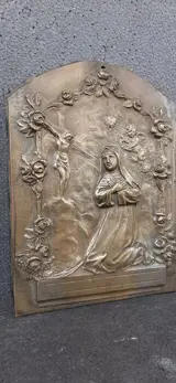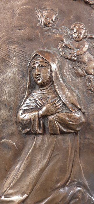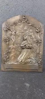 Bronzen plaquette. Het stelt de heilige Clara in gebed voor in een rozentuin met vliegende engelen en het kruisbeeld. Santa Chiara, die in Assisi woonde, trad in de voetsporen van San Francesco, stichtte de Orde van de Arme Clarissen en wordt erkend als patroonheilige van de vergulders, de blinden, de strijkers en de wasvrouwen. Afmeting 27x20cm.