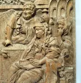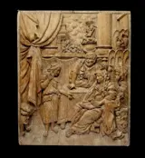 Schitterend eikenhouten reliëfpaneel met een scène uit het Oude Testament in een oude tempelomgeving.