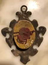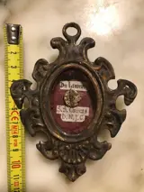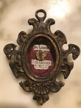 Relikwie van de Passie van Christus DE LIGNUM SS CRUCIS DNJC, gevat in een zwaar geoxideerde metalen doos in renaissancestijl. Intacte dia, relikwie geplaatst op een geweven cirkel met gouden draad in een met zijde gevoerde doos vergezeld van het label. Op de achterkant zijden draad en zegel. Afmetingen: hoogte 11, breedte 9 en dikte 1,7 cm. Gewicht ongeveer 95 gram. Het object wordt verpakt en verzonden met Poste Italiane.