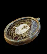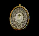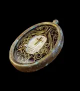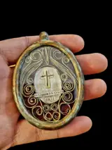 Waardevolle en zeldzame eliquary in massief brons, in goede algehele staat, met een opmerkelijke vergulde cartouche en filamentwerk aan de binnenkant. De reliekschrijn bevat de zeldzame relikwie van een fragment van het Heilig Kruis van Jezus Christus. Op de achterkant heeft het zijden draden in goede algemene staat, en een kardinaalszegel uit de tweede helft van de jaren 1800. Snelle en zorgvuldige verzending wordt verzekerd door een koeriersdienst en een pakket met tracking. Geen minimumprijs ondanks dat het item uiterst zeldzaam is.
