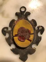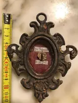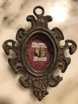 Relikwie van de Passie van Christus DE SPINEA DNJC in een sterk geoxideerd metalen reliekschrijn, reliek geplaatst op een geweven cirkel in gouden draad met een relatieve tag geplaatst op bordeauxrode zijde. Intacte glijbaan. Op de achterkant zijden draad en zegel. De afmetingen zijn: hoogte 11, breedte 9 en diepte 1,7 cm. Gewicht ongeveer 95 gram. Het item wordt zorgvuldig verpakt en verzonden via Poste Italiane.