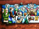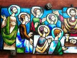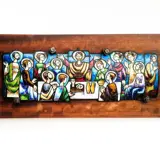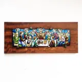 Kostbaar emaille Heilig Avondmaal op hout in heldere, sterk contrasterende kleuren. Het hele schilderij 51x22cm. Alleen emaille 40 x 13 cm. Over het algemeen in goede staat, maar op sommige plaatsen is het emaille afgebroken.Het hout heeft wat vlekken.