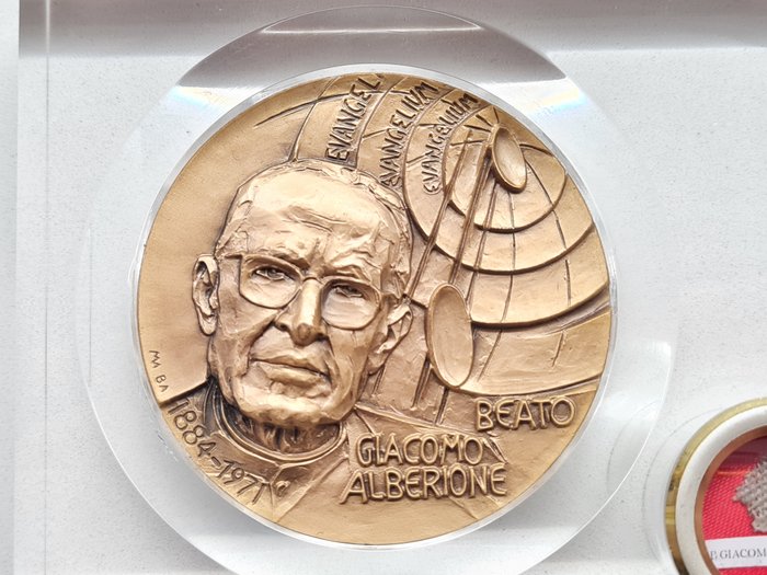 Plexiglas structuur met daarin de medaille van de zalige Giacomo Alberione 1884-1971 27 4 2003, Inc. Maba, diameter 60 mm